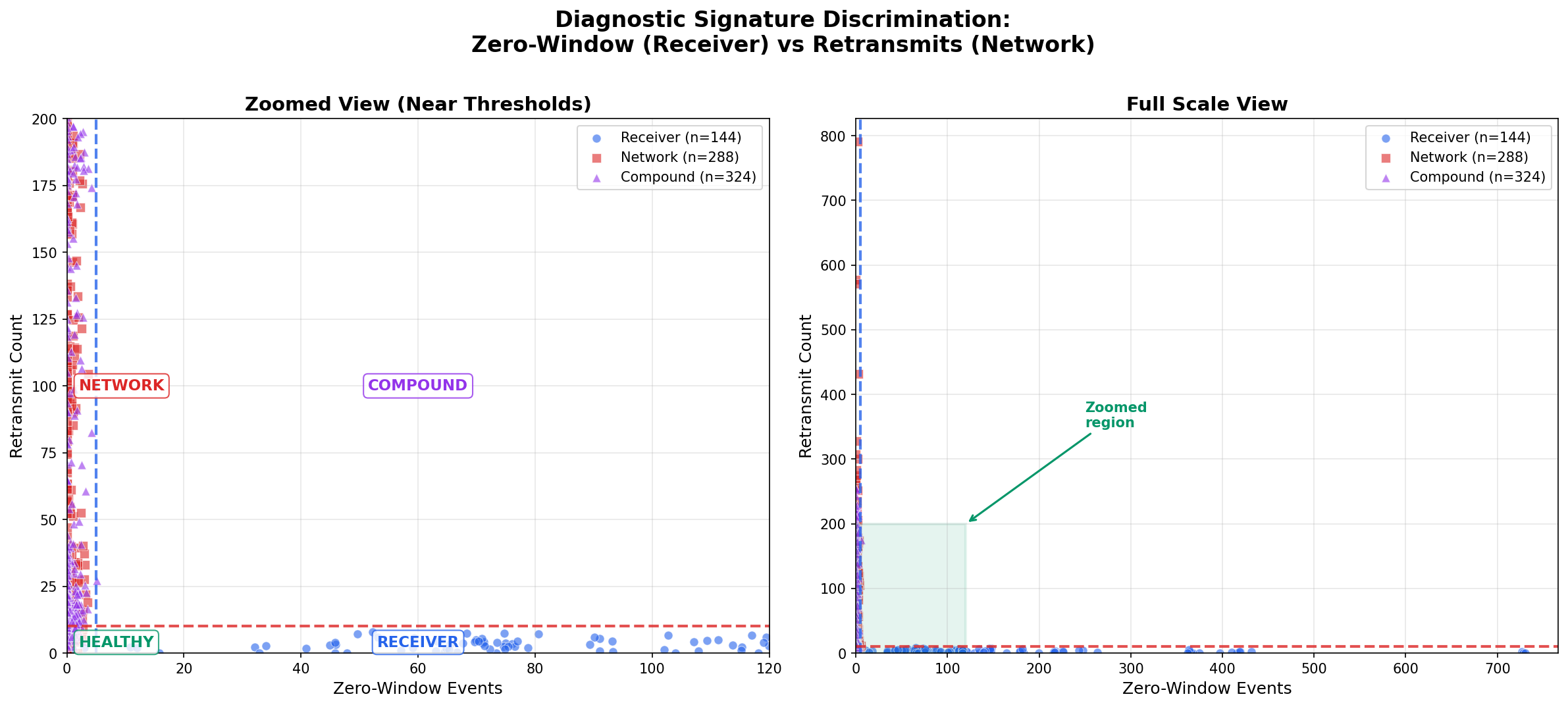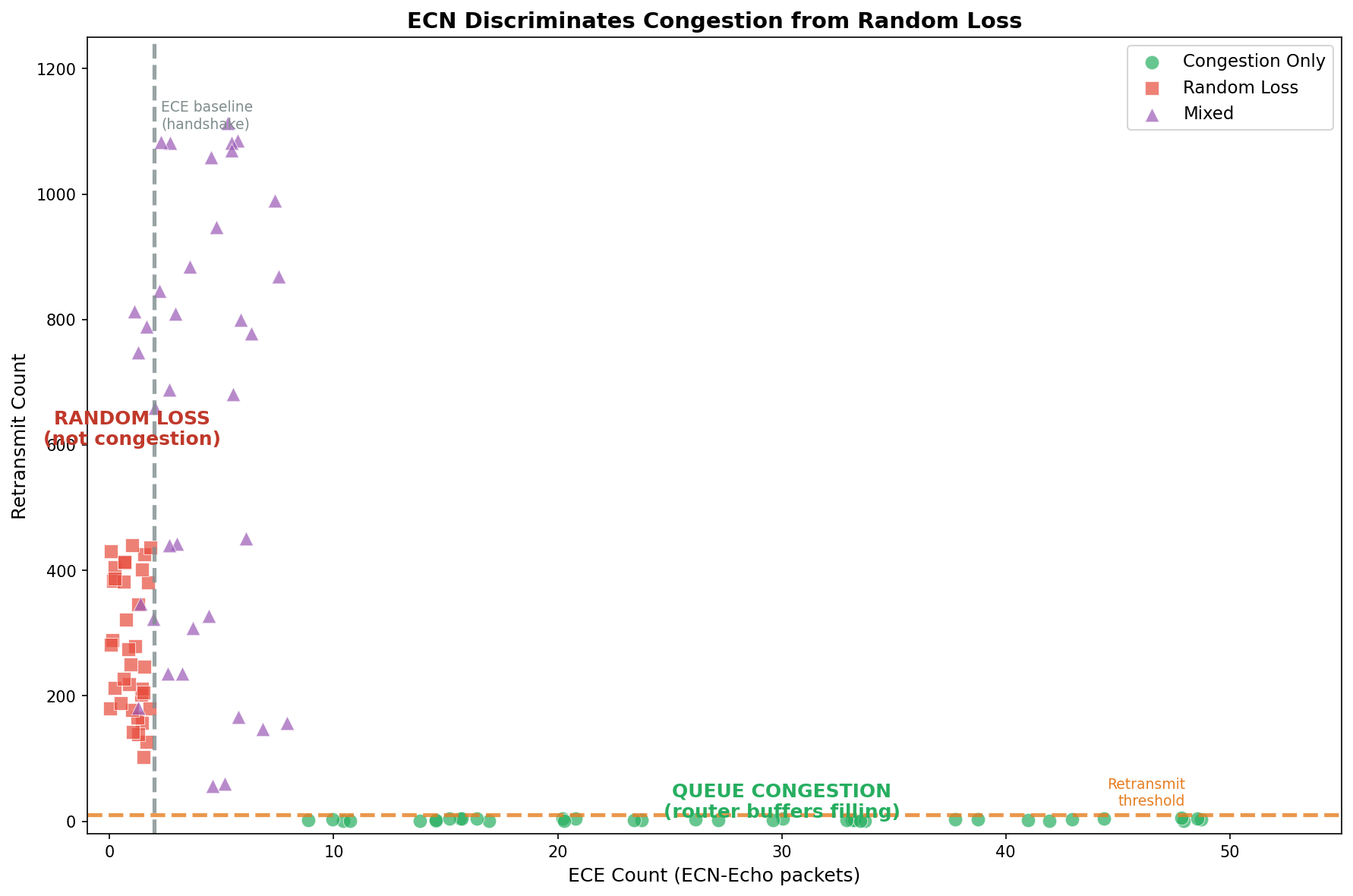 The scatter plot shows clear separation: queue congestion (green circles) clusters at low retransmits with elevated ECE counts, while packet loss (red squares) clusters at high retransmits with only baseline ECE from the TCP handshake. The dashed lines show our diagnostic thresholds.