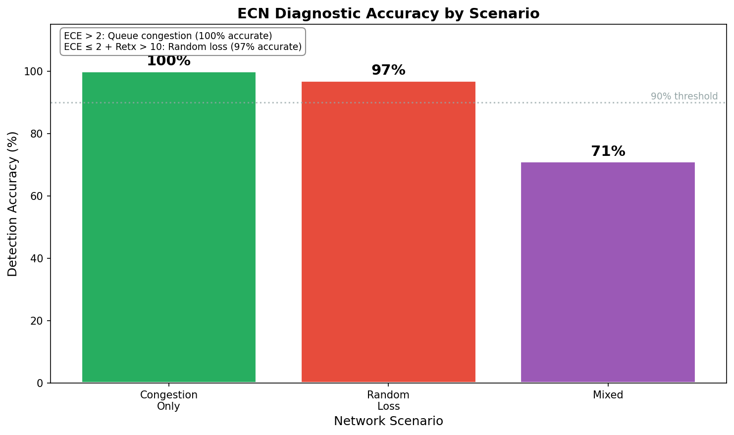 ECN successfully distinguishes congestion from random loss with high accuracy in single-cause scenarios. Mixed scenarios are harder—but knowing both problems exist is still valuable.