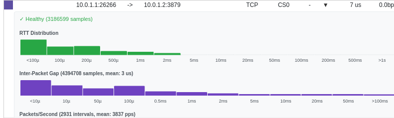 For statistical characterization, JitterTrap’s Flow Details view provides histograms of inter-packet gap and RTT distributions: