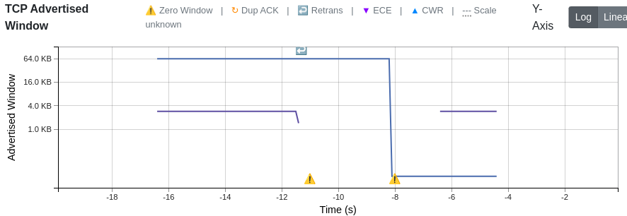 In this capture from a simulated receiver stall, the advertised window (blue line) drops sharply from 64KB to near-zero around t=-11s, triggering the first Zero Window marker (⚠️). The window recovers briefly, then drops again at t=-8s. Notice the Retrans marker (↩) appearing during recovery—this is TCP’s persist timer probing to check if the receiver has space again.