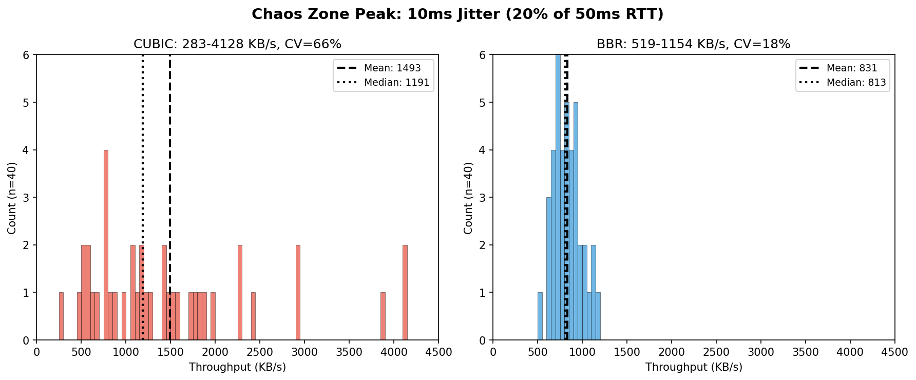 BBR achieves roughly half the throughput of CUBIC at this operating point. However, CUBIC’s higher mean masks significant run-to-run variance. In the worst part of the chaos zone (±10ms jitter), CUBIC’s CV reaches 66%—meaning some runs achieve good throughput while others collapse entirely.