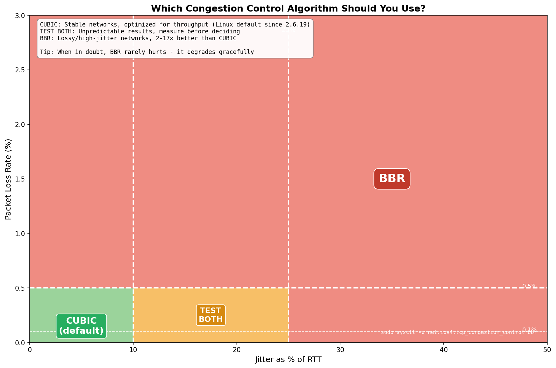 - Stable networks (jitter < 10% of RTT, loss < 0.1%): Use CUBIC (Linux default)