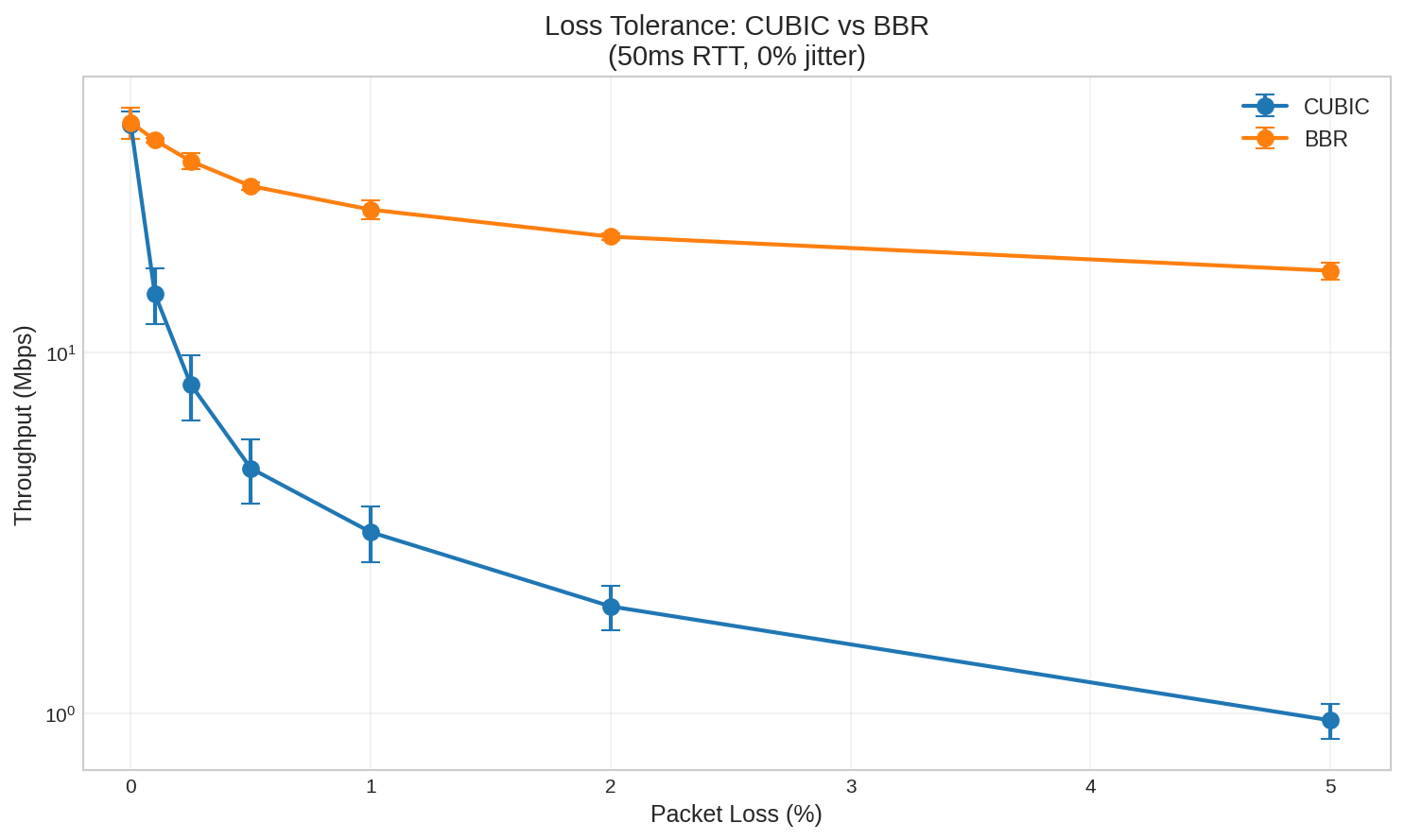 At 5% loss, the difference is staggering: BBR provides 17.6x the throughput of CUBIC.