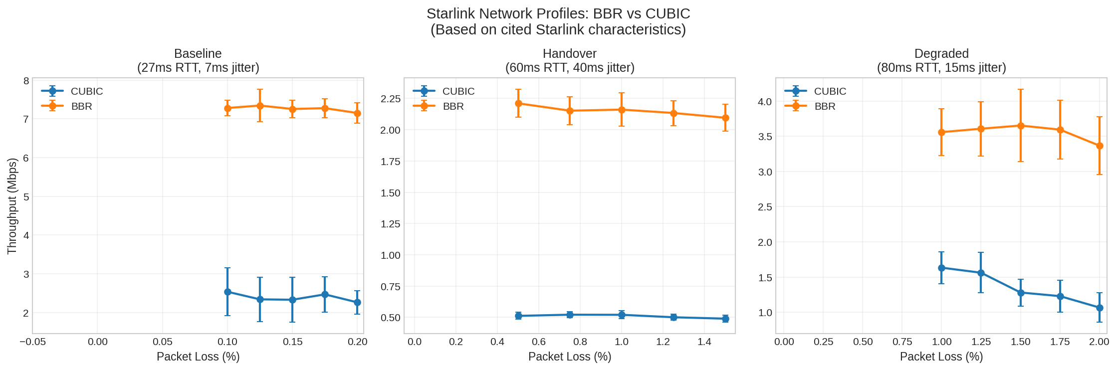 Critically, Starlink’s loss is not congestion-related—it’s caused by satellite handovers and radio impairments. CUBIC’s loss-based congestion control misinterprets these as congestion signals, causing unnecessary throughput reduction.